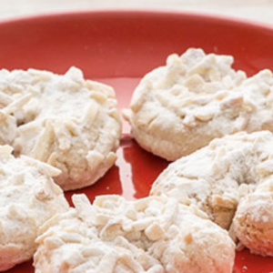La masa para los bizcochos está lista, por lo que podemos proceder a formar pequeñas bolitas de masa que espolvorearemos con unos granos de almendra por la superficie.